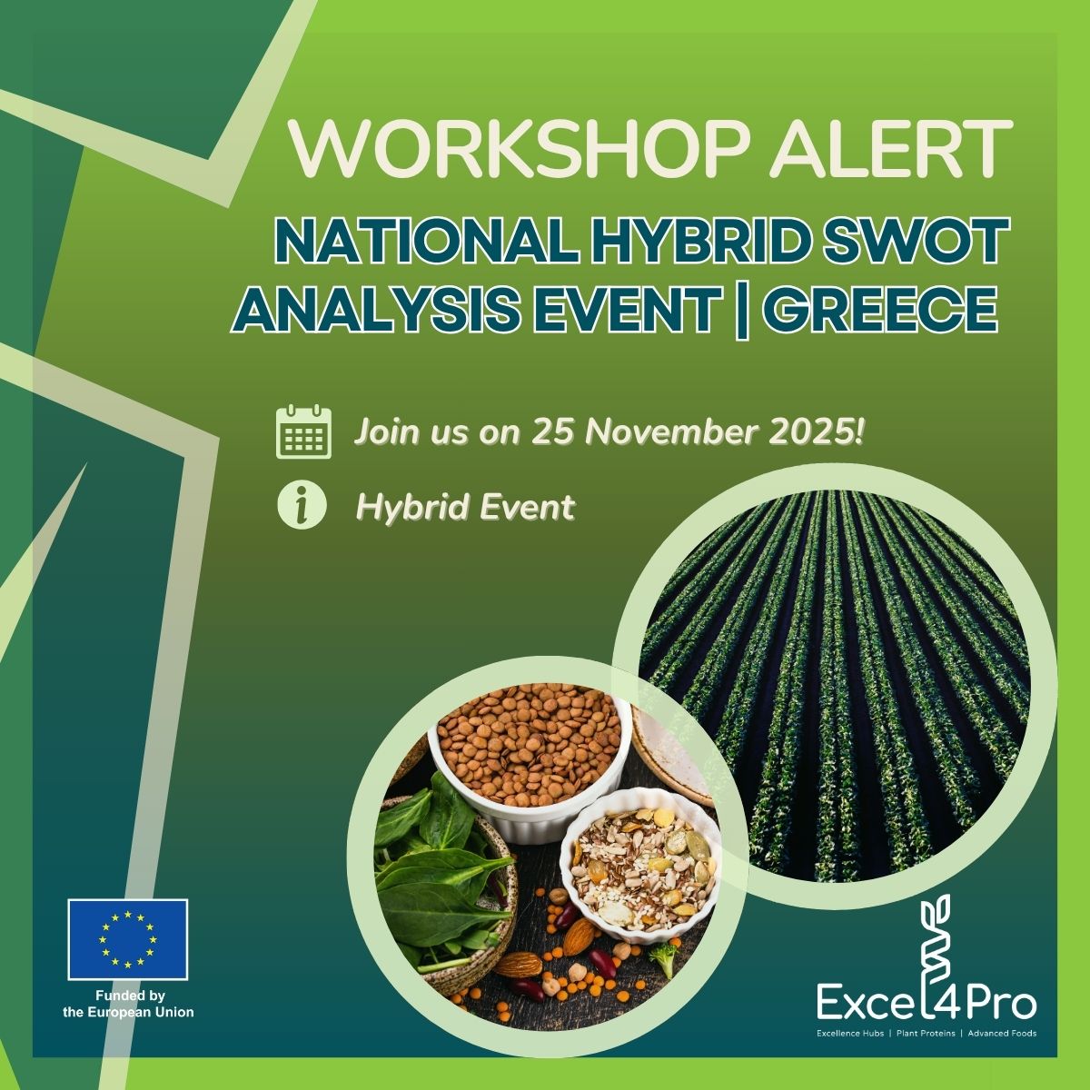 The Plant-based Protein Hub of Greece, coordinated by National Technical University of Athens (NTUA), together with partners including JOTIS, PRINSUS, Reframe.food, and Region of Peloponnese, under the Excel4Pro Project, is inviting Greek companies, startups, and research organizations to its national hybrid SWOT Analysis workshop on 25 November 2025 at School of Chemical Engineering, National Technical University of Athens.